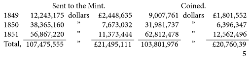 Monsieur Emilie Chevalier, who has just returned from a government mission to Panama, in a report to the Minister for Foreign Affairs, considers the result as having been much larger. The gold brought as freight by steamers in 1850, he estimates at 9250,306,525 dollars. The author of the report adds, on the testimony of a person whom he considers as competent to give a sound opinion, that the sums carried by passengers are not less than three fourths of the amounts brought as merchandize; and thus he arrives at the extraordinary figures of 88,000,000 dollars (more than 93470,000,000 francs) for a single year. At St. Francisco, where they are able to form probably a more correct estimate on a subject so difficult to trace accurately, they do not value the amount of gold carried by passengers at above one-fourth the amount taken in freight. Even on this supposition there will be a sum of 25,000,000 dollars, or above 94133,000,000 francs to be deducted; but it appears to me very doubtful, if the produce of 1850 exceeded this figure of 95329,000,000 francs, according to the French documents already referred to. We have more valuable documents of another kind to rely upon, in the quantities of gold coined at the United States’ Mint; the following are the official figures: —