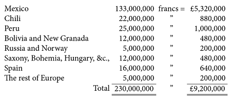Mons. de Humboldt estimates the amount of silver annually produced at the commencement of this century at 870,000 kilogrammes (about 139193,000,000 francs). In 1847, M. Michel Chevalier, considered the annual production to be 775,000 kilogrammes, (about 140172,000,000 francs), but there is reason to suppose that this writer under-estimated the returns of the Mexican mines, which he placed at 14118,500,000 piastres, and in a later work, the same authority states the production at 142900,000 kilogrammes. The English paper, The Economist, estimated the return of 1850 at 143191,772,000 francs; the actual production, however, appears to have been much larger. It cannot be placed at a lower figure than 1,000,000 of kilogrammes for 1851, or at about 144230,000,000 francs. The following is the table of details: