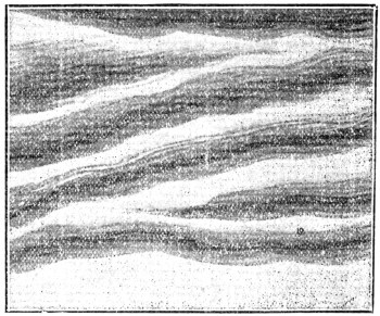 Looking carefully at the visible texture of the fingers and palms, we see, then, that the cutaneous ridges lie, for the most part, closely and evenly, like furrows in a well-ploughed field. But just as in some fields the ploughman has perforce had to swerve and veer round some fast embedded boulder or old tree stump, varying his intended pattern, so, too, in our fingers curious divergent lineations are found to occur, and we cannot very well tell the reason why. Coloured patches may be designed like so many pretty wall-paper designs, to enclose these patterns in books on finger-prints, but I, for one, cannot see that they throw any light on their genuine nature and origin. We find, under purely mechanical conditions, similar patterns produced in the ripples of a sub-aerial sand-drift and on a tidal shore. While writing this chapter, I saw to-day similar deltas, junctions, forks, and the like, on a lake whose frozen surface was thinly sprinkled with fine dry snow. The lines were mostly parallel, but where certain gusts or eddies had occurred they had been broken up into patterns not unlike those of finger-tips.