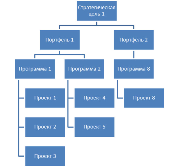 Для понимания места проекта в общей деятельности компании проекты выстраиваются в иерархию – от стратегических целей непосредственно до проектов через портфели и программы.