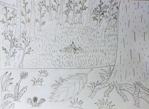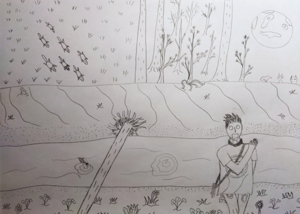 Фёдор сидел на камне с задумчивым лицом: «Так, меня засосало в дыру и теперь я в каком-то лесу. Если учесть всю эту фантастику, которая теперь ещё и явью стала, то я даже могу находиться в другом мире. А это значит, что помощи мне точно ждать не стоит. И из всего инвентаря и сумки у меня ровно: 1 шоколадка со вкусом клубники, 2 батона белого хлеба, 2 баночки законсервированных шпротов, 1 сэндвич с бужениной, духи с очень резким запахом, моток прочной верёвочки, миниатюрный медный кулон и 15 листов белого картона. Если экономить, то еды мне хватит максимум на два дня. И среди этой пищи ни единой бутылки воды!» Фёдора привлёк кулон, изготовленный из меди, и имеющий вид миниатюрного меча: «это конечно глупо, но если его наточить, то возможно я смогу им что-нибудь нарезать.» Он подошел к большому обломку и начал точить кулон. «Ок, теперь у меня есть ножик.» – с этими словами Фёдор посмотрел на свой инвентарь, и начал делать что-то интересное. Он достал из обломков длинный, но тонкий деревянный шест, который немного напоминал дугу. Сделал в нём зазоры с обеих сторон. Потом Фёдор начал отмерять длину верёвки. Через пару минут он держал в руках самодельный лук, а также он сделал 4 стрелы из прямых веток и белого картона. Однако жизнь такова, что прямых веток больше не оказалось, а Фёдор за всю свою не долгую жизнь ни разу не стрелял из лука. В общих чертах он будет крайне неумелым стрелком.