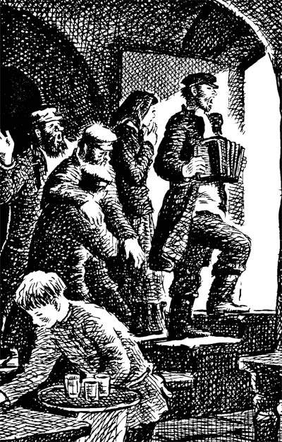 Хозяин заведения был в другой комнате, но часто входил в главную, спускаясь в нее откуда-то по ступенькам, причем прежде всего выказывались его щегольские смазные сапоги с большими красными отворотами. Он был в поддевке и в страшно засаленном черном атласном жилете, без галстука, а все лицо его было как будто смазано маслом, точно железный замок. За застойкой находился мальчишка лет четырнадцати, и был другой мальчишка моложе, который подавал, если что спрашивали. Стояли крошеные огурцы, черные сухари и резанная кусочками рыба; все это очень дурно пахло. Было душно, так что было даже нестерпимо сидеть, и все до того было пропитано винным запахом, что, кажется, от одного этого воздуха можно было в пять минут сделаться пьяным.