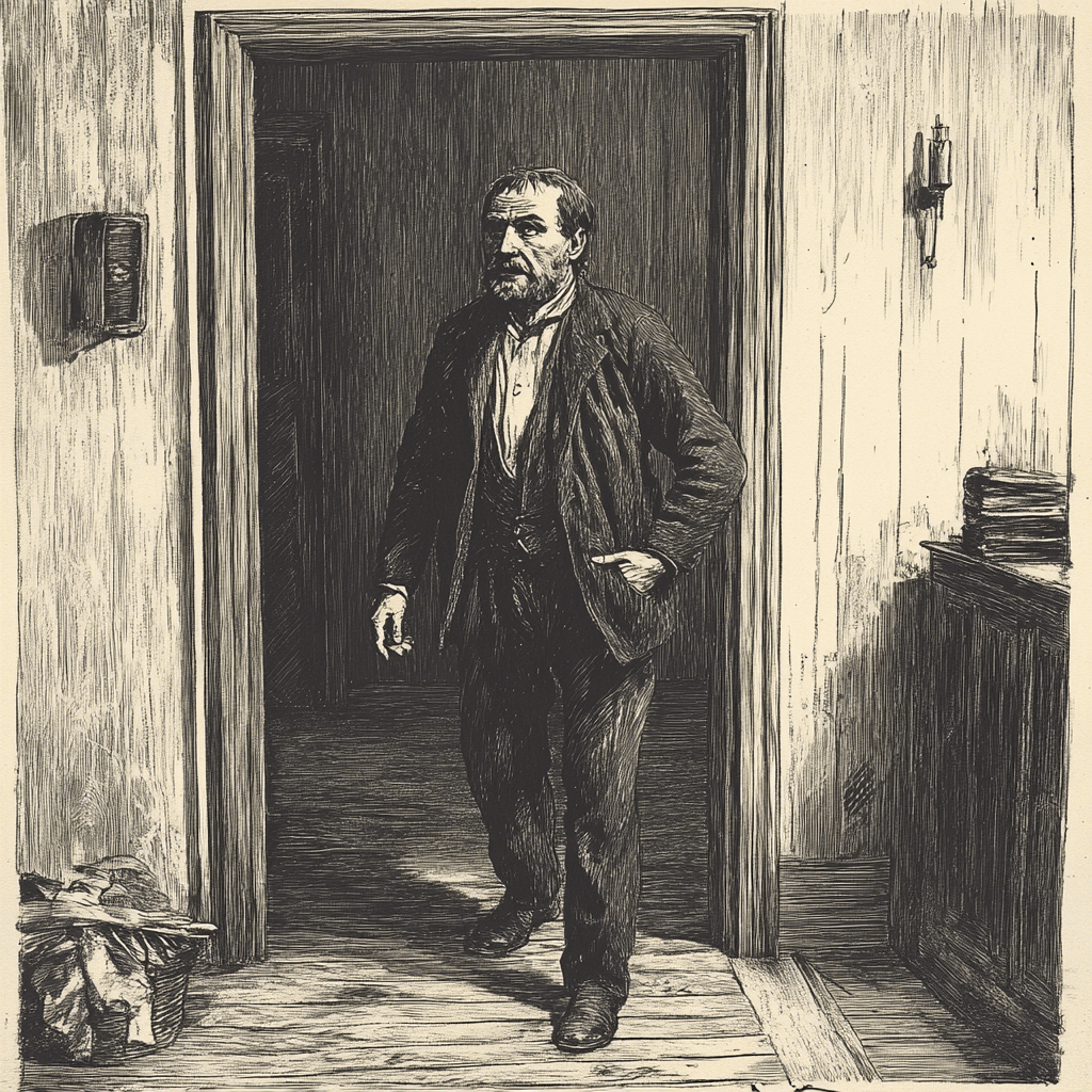 Услышав вопль жены, безумный старик остановился в ужасе от того, что сделалось. Вдруг он схватил с полу медальон и бросился вон из комнаты, но, сделав два шага, упал на колена, уперся руками на стоявший перед ним диван и в изнеможении склонил свою голову.