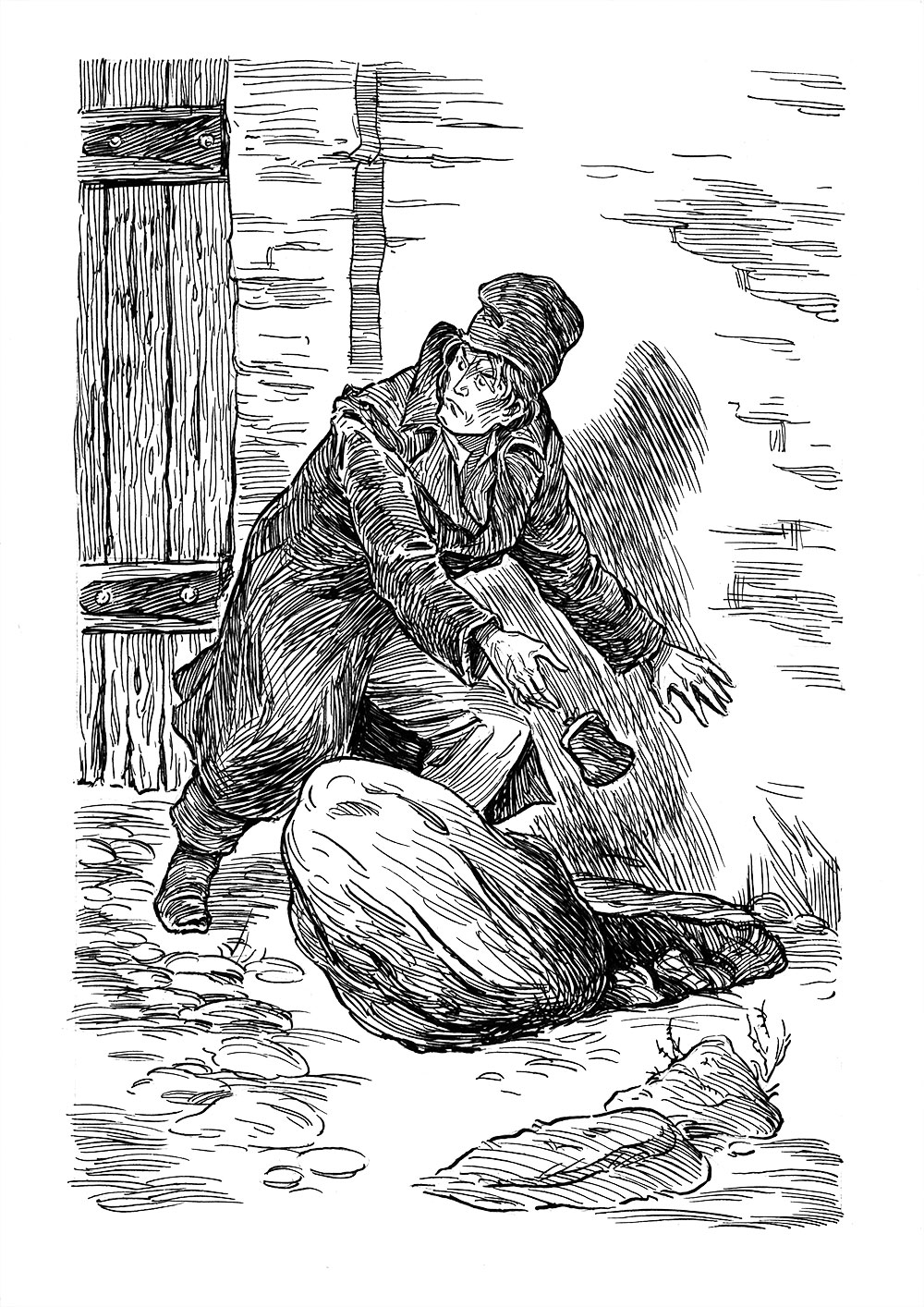 Он нагнулся к камню, схватился за верхушку его крепко, обеими руками, собрал все свои силы и перевернул камень. Под камнем образовалось небольшое углубление; тотчас же стал он бросать в него всё из кармана. Кошелек пришелся на самый верх, и все-таки в углублении оставалось еще место. Затем он снова схватился за камень, одним оборотом перевернул его на прежнюю сторону, и он как раз пришелся в свое прежнее место, разве немного, чуть-чуть казался повыше. Но он подгреб земли и придавил по краям ногою. Ничего не было заметно.