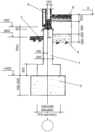 Рис. 3.2. Столбчатый железобетонный фундамент: 1 – железобетонный монолитный столбчатый фундамент; 2 – подушка из среднезернистого песка; 3 – отмостка; 4 – слой уплотненного песчаного грунта; 5 – каркасная стена; 6 – цокольное перекрытие с дощатым полом