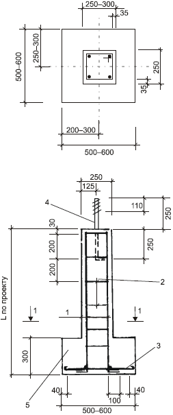Рис. 3.3. Конструкция железобетонного столбчатого фундамента: 1 – стержень из арматуры диаметром 10 мм; 2 – хомуты (арматура диаметром 6 мм); 3 – сетка арматурная с ячейками 150x150 мм из проволоки диаметром 6 мм; 4 – анкерный болт М16; 5 – бетон В15 (М200)