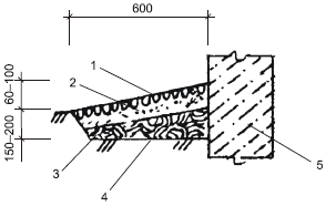 Рис. 3.4. Деталь булыжной отмостки: 1 – булыжник; 2 – подсыпка из среднезернистого песка; 3 – жирная мятая глина; 4 – уплотненный грунт; 5 – фундамент ленточный либо забирка из бетона, кирпича