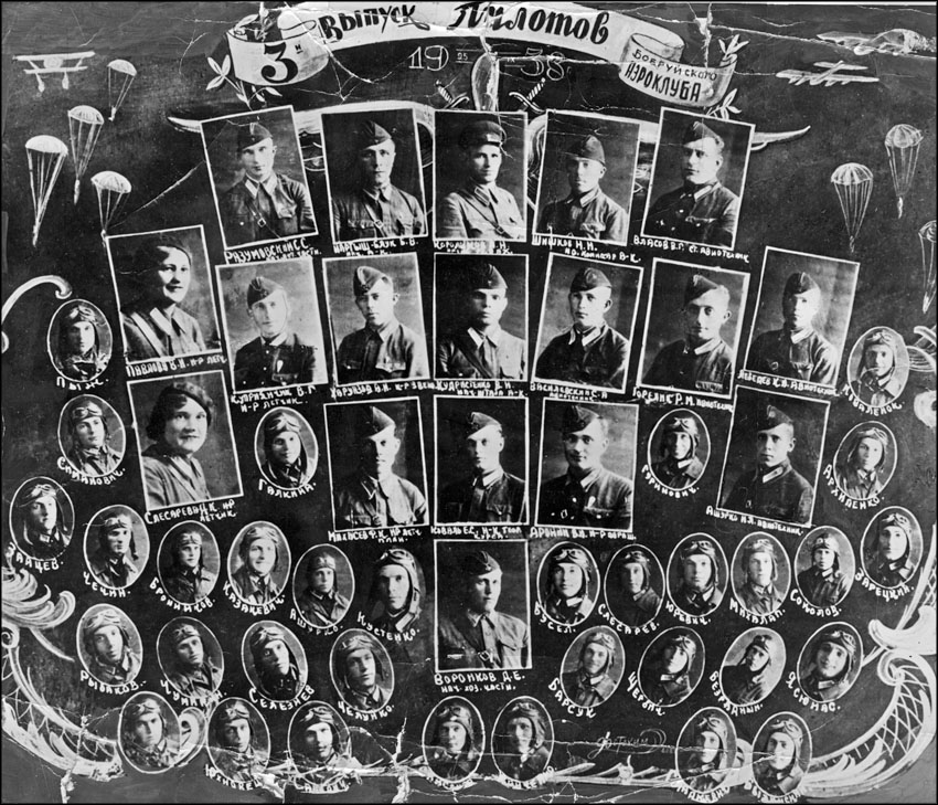 3-й выпуск пилотов Бобруйского аэроклуба. Второй сверху в крайнем правом углу – курсант Федор Архипенко