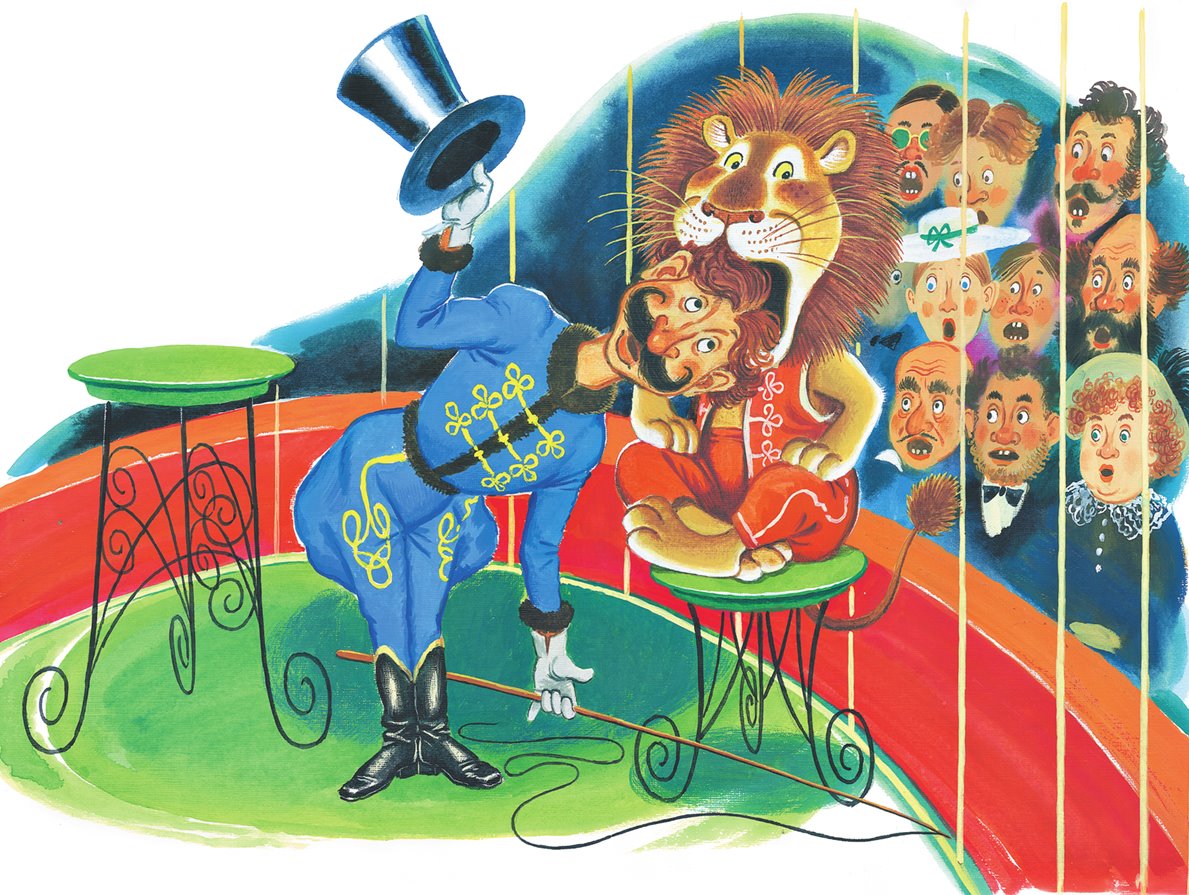 Директор снял цилиндр и просунул голову прямо в львиную пасть!.. В зале раздался стон. Зрители в ужасе закрыли глаза. Но ничего страшного не случилось: постояв немного в этой позе, директор не спеша вытащил голову. И все облегчённо вздохнули.