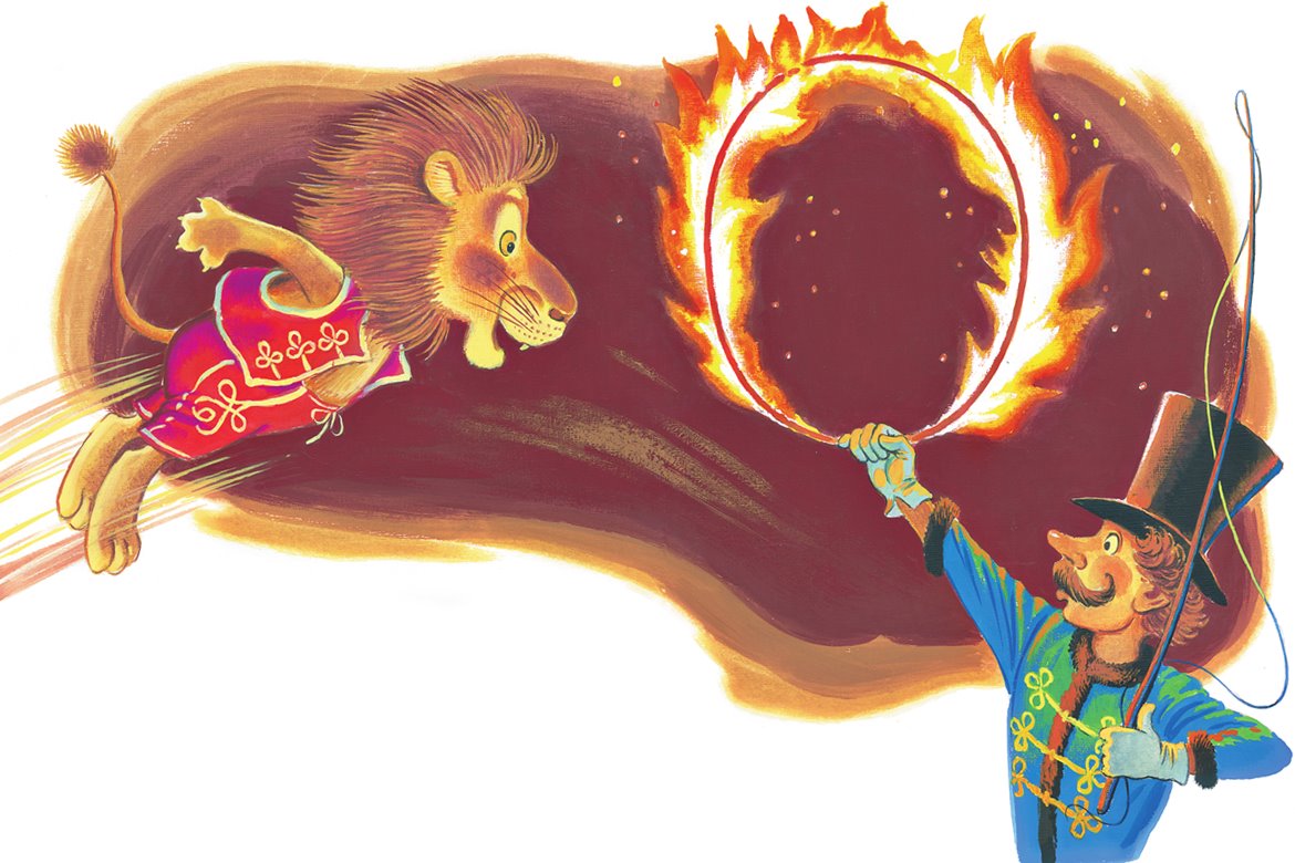 …В зале погас свет. Зазвучала дробь барабана. Директор поднял пылающий обруч, отбрасывающий багровый свет на испуганных зрителей. Барабаны забили сильнее и тревожнее. Бонифаций сжался, готовясь к прыжку. Когда пламя охватило весь обруч, директор громко выкрикнул: