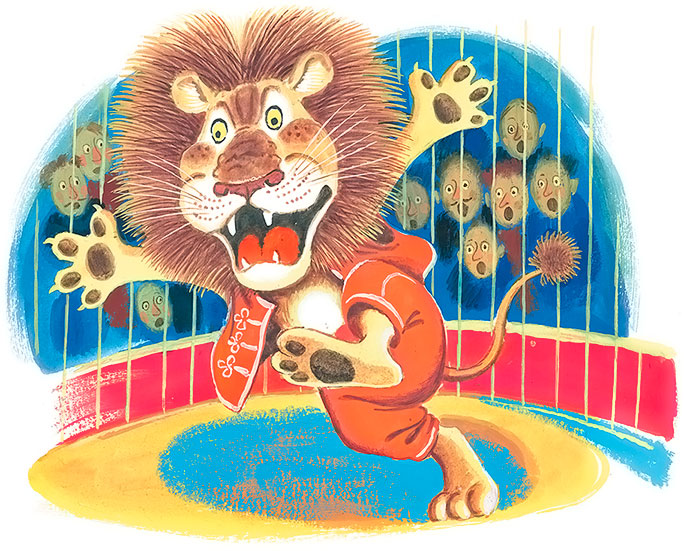 Во время представления лев обычно забивался куда-нибудь в дальний угол, и, пока на ярко освещённой арене скакали лёгкие как пушинки наездницы на красивых белых лошадях, а размалёванные клоуны потешали публику разными шутками, он сидел в одиночестве, грустный и усталый, ожидая своего выхода.