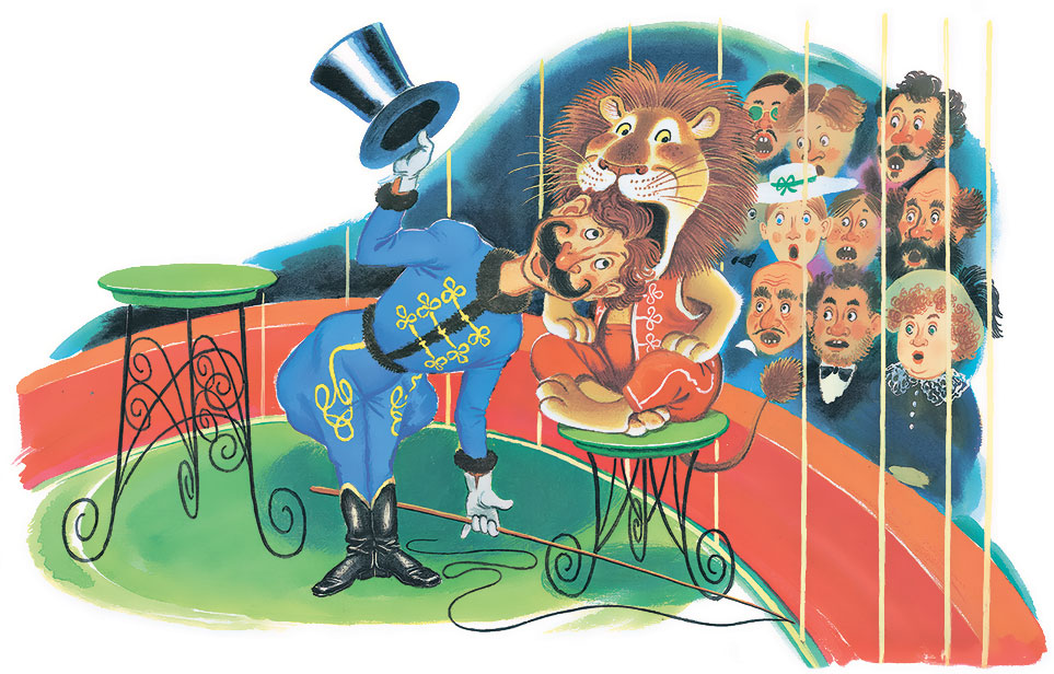 Директор снял цилиндр и просунул голову прямо в львиную пасть!.. В зале раздался стон. Зрители в ужасе закрыли глаза. Но ничего страшного не случилось: постояв немного в этой позе, директор не спеша вытащил голову. И все облегчённо вздохнули.