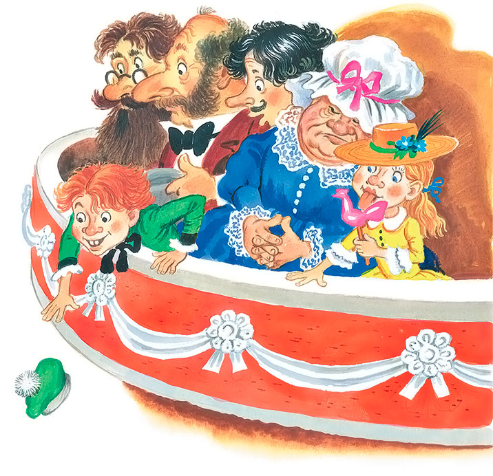 Бонифаций ловко взобрался по верёвочной лестнице под самый купол цирка, где была протянута тонкая проволока. Зазвучала музыка, и Бонифаций – уже в который раз! – стал проделывать на проволоке трудные и опасные номера.