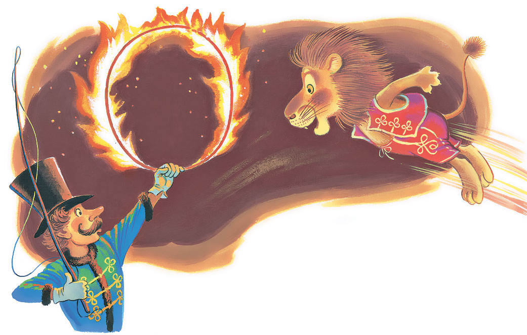 …В зале погас свет. Зазвучала дробь барабана. Директор поднял пылающий обруч, отбрасывающий багровый свет на испуганных зрителей. Барабаны забили сильнее и тревожнее. Бонифаций сжался, готовясь к прыжку. Когда пламя охватило весь обруч, директор громко выкрикнул:
