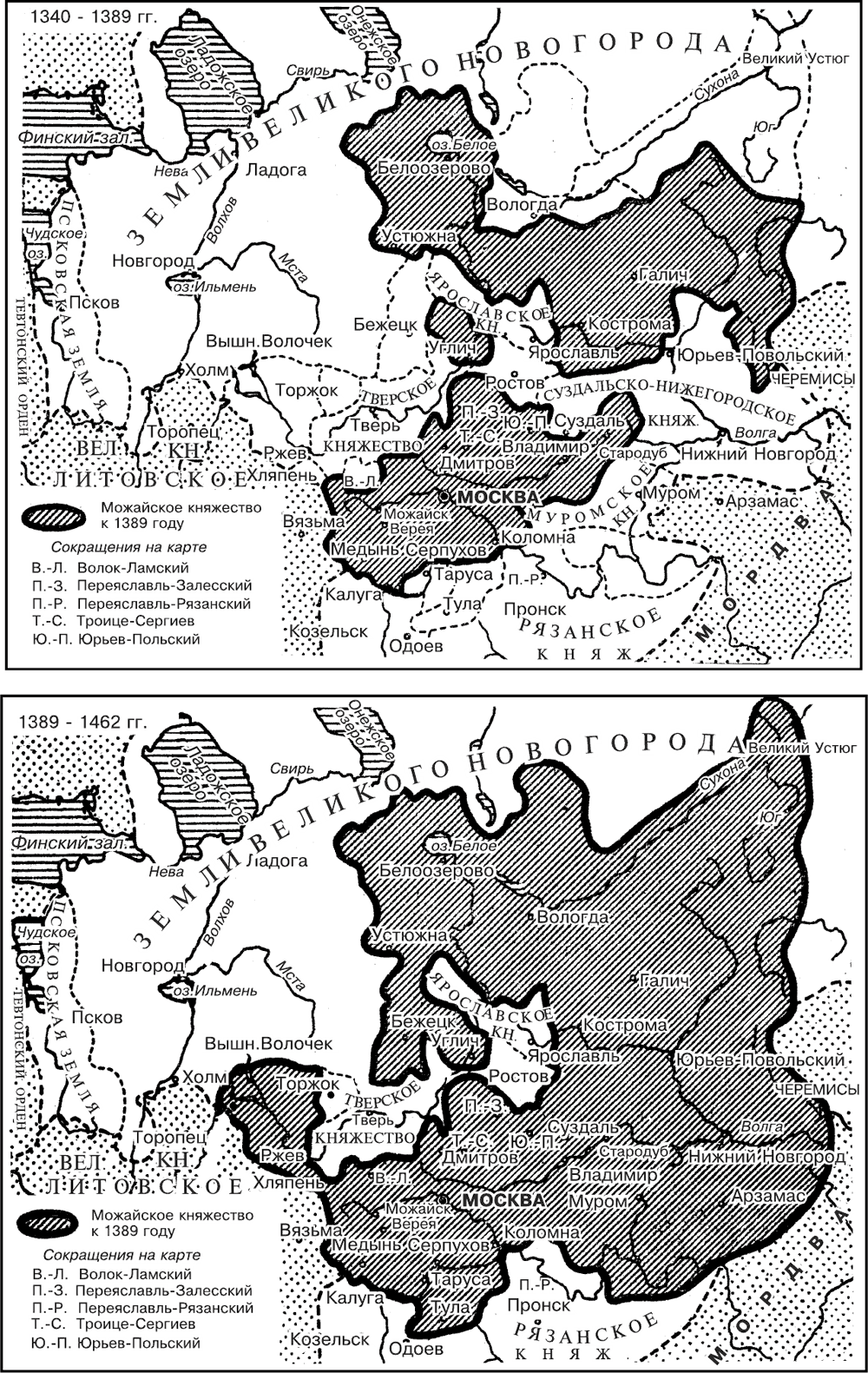 В то время Москва являлась небольшим и небогатым уделом. Однако Даниил Александрович сумел значительно расширить его границы. Для того чтобы получить контроль над всей рекой Москвой, в 1301 г. он отнял у рязанского князя Коломну, расположенную у впадения Москвы-реки в Оку. В 1302 г. Даниилу Московскому был завещан Переяславский удел, который был окончательно присоединен к Москве во время княжения его сына Юрия Даниловича (1303–1325 гг.). Постепенно границы княжества расширялись. В 1303 г. к Москве был присоединен Можайск, входивший в состав Смоленского княжества.