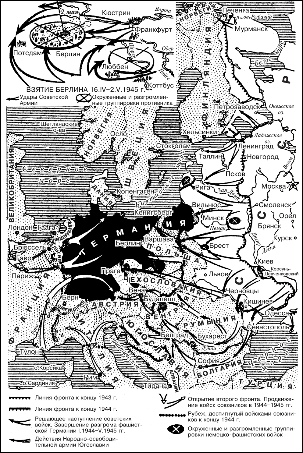 В апреле-мае 1945 года советские войска завершили разгром немецких войск, штурмом овладели столицей фашистской Германии. На р. Эльбе произошла историческая встреча союзников. Германское командование было вынуждено капитулировать. В ходе своих наступательных операций Советская Армия внесла решающий вклад в освобождение оккупированных стран от фашистского режима. А 8 и 9 мая стали в большинстве стран Европы и в Советском Союзе Днем Победы.