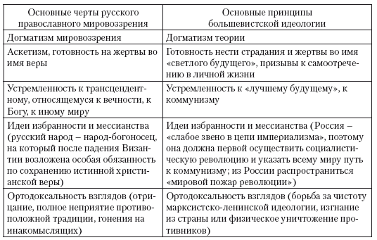 Таблица разработана на основе предложенного А. И. Белкиным соотношения основных черт русского национального характера и основных принципов большевистской идеологии (см.: Белкин А. И. Государственно-церковные отношения в России: учебное пособие. Саранск, 2004. С. 120).