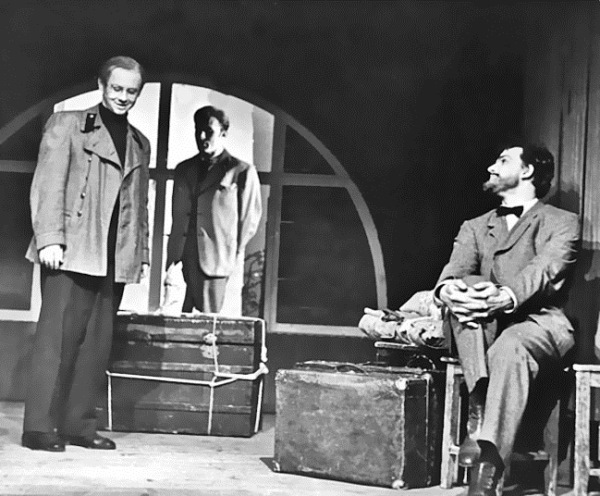 Сцена из дипломного спектакля «Вишневый сад» А. П. Чехова. Олег Табаков в роли Пети Трофимова, Евгений Урбанский – Лопахина. Третий выпуск студентов Школы-студии МХАТ им. Вл. И. Немировича-Данченко. Руководитель – В. О. Топорков. 1957 год