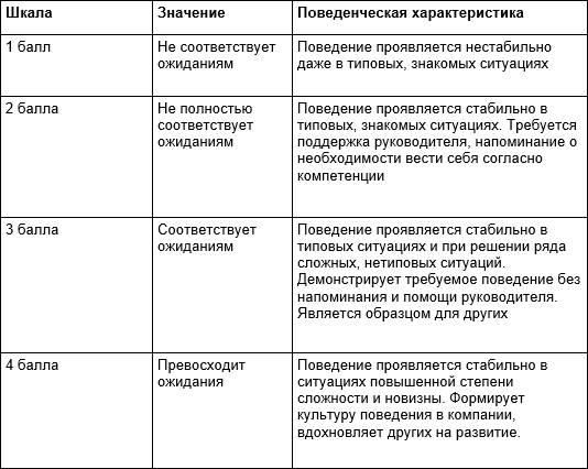 Обсуждая шкалу оценки, решили оставить действующую четырехбалльную систему: 1 – не соответствует ожиданиям; 2 – не полностью соответствует ожиданиям; 3 – соответствует ожиданиям; 4 – превосходит ожидания. Кроме того, мы решили дать дополнительные поведенческие характеристики, соответствующие каждому баллу.