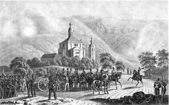 Смоленская битваЯ уже сказал, что генерал Неверовской дал знать от Красного главнокомандующему, что неприятель идет к Смоленску. Посему немедленно был послан корпус Раевского и пришел к свету в Смоленск, а часть кавалерии ночью; оттого я и видел Литовский уланский полк. Раевский принял и нас в команду, сам остановился у Малаховских ворот и поставил на возвышенности батарею. Неприятель с рассветом дня сделал сильный натиск на город множеством стрелков; прежде сего пустил в город множество ядер, бомб и гранат, так что город во многих местах загорелся. Дело сие было на рассвете. Наш 1-й батальон, бывший под Красным и в ретираде от оного в резерве, поставлен в огороды, в стрелки; но как неприятельских стрелков было гораздо более, то наш несчастный батальон из тысячи человек[32] в течение ¼ часа вышел едва ли с 300 человеками: остальные были переранены, так что и одной роты нельзя было набрать[33]. Он и оставался где-то в городе оба дня сражения. Неприятель обложил весь город по Днепр. Наша первая армия стояла на горе за Днепром, а вторая билась два дня упорно, так что из первой армии дан был сикурс: 3-я дивизия Коновницына и лейб-егерский полк. Это угодно было цесаревичу, который сам был при первой армии. С начала сражения наш батальон отправился на правый фланг города или за город к кладбищу. Мы были весь день в стрелках по мелким кустам. Я был послан к генералу Раевскому просить помощи, ибо мы с 4 до 10 часов утра были одни и потеряли значительно людей, к тому же по обширности места удержать неприятеля не могли. Генерал приказал из дивизии принца Виртембергского полку Киевскому идти со мною, а после полудни была не только наша дивизия, да и много пехотных полков на пункте том, где мы несколько часов держались с батальоном. Отрядом нашим командовал генерал Оленин. Хотя я постоянно не был в стрелках, но по обязанности адъютанта водил по очереди из резерва роты в стрелки, что еще хуже: я был на лошади и в невысоких кустах мог быть верною целью. Весь день сражались неимоверно стойко, но к вечеру не могли вынести сильного напору и ретировались в город. Тогда генерал Оленин остановил бегущих, велев вывести орудие на улицу. Люди остановились и прогнали неприятеля, а драгуны после докончили, и на ночь город остался за нами. С рассветом на другой день также потеха возобновилась, но нас посылали только четыре раза в стрелки; батальон убавился более половины. Два ротных командира наповал были убиты; один из них убит возле своего дома, поручик Кунцевич, двое тяжело ранены, а прочих офицеров со мною на лицо из 21 оставалось 8.