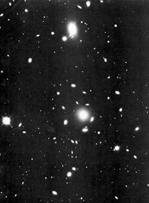 Тяготение действует и на еще больших расстояниях. Наше звездное скопление выглядит незаметной точкой на рис. 8, где показана типичная галактика. И опять-таки ясно, что эта галактика держится как единое целое благодаря какой-то силе. А никакой другой силы, кроме тяготения, здесь предположить нельзя. Когда мы переходим к таким масштабам, мы уже не можем проверить справедливость ньютоновского закона. Но несомненно, что в таких гигантских звездных образованиях – в этих галактиках, которые простираются на 50–100 тысяч световых лет, тогда как расстояние от Солнца до Земли составляет только 8 световых минут, – даже на таких огромных расстояниях действуют силы тяготения. Рис. 9 свидетельствует о том, что силы тяготения простираются еще дальше. Это так называемое скопление галактик. Все они собраны в один ком, как и звезды, только этот ком составлен не из звезд, а из «крошек» вроде той, которую вы видите на рис. 8.
