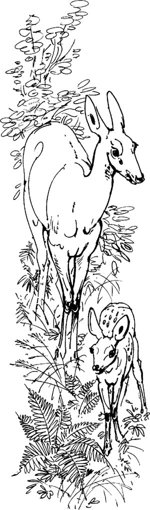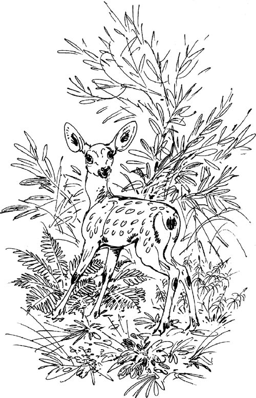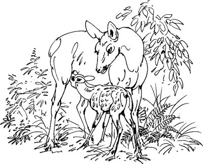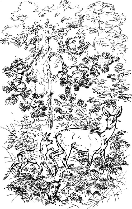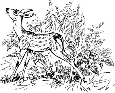 Она выступала медленно, высоко поднимая ноги. Бемби не спускал с нее глаз. Любопытство, страх, ожидание чего-то необычайного боролись в его душе. Он видел, как мать сторожко прислушивалась, видел, как напряжено ее тело, и сам напрягся, готовый в любую секунду броситься наутек. Но вот мать вытянула шею, удовлетворенно осмотрелась и крикнула: