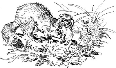 Это хорек охотился за мышью. Вот он прошмыгнул мимо них, осмотрелся и принялся уничтожать добычу…