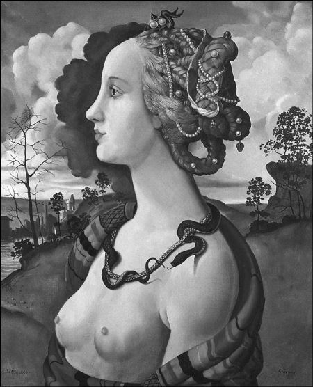 Клан Веспуччи имел контакты с двором. Симонетта Веспуччи, признанная красавица, стала объектом показного, возможно, аффектированного восхищения со стороны Джулиано де Медичи, любимого брата властелина. Быть знакомой с la bella Simonetta означало любить ее, и Флоренция объединилась в своем обожании. Она предположительно и изображена на знаменитом, но, к несчастью, анонимном портрете – одном из наиболее чарующих и чувственных портретов, оставшихся нам от флорентийского Ренессанса. На портрете – совершенный профиль девушки с обнаженной грудью и змеей, обернувшейся кольцом вокруг ее шеи и кусающей собственный хвост. Сочетание чувственности и таинственности действует неотразимо. Что хотел показать художник? Хрупкость красоты? Вечность любви? Картина предлагает больше, чем просто эротическое возбуждение; она заставляет задуматься о ее внутреннем символизме. Она возбуждает физическое влечение и интеллектуальную интригу. Кто может желать большего от женщины?