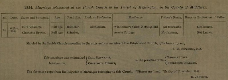 In the following certificate12 you will perceive that the lady is described as of "Acacia Cottage, Kensington." The identity of the name with that given by both Julie and Leopoldo, as the proper designation of the Baron's "medium," confirmed my suspicion that it was in fact to the girl Rosalie that the Baron was married under that name, notwithstanding the strong opinion of Julie as to the impossibility of such being the case. Still, however, it was possible that this might, after all, be a mere coincidence; and I therefore proceeded to make such inquiries as seemed most likely to elucidate the point. I had considerable difficulty in finding the house, which two or three years back was included in the regular numbering of the row of similar tenements in which it stands; but I at last succeeded in identifying it. I found the landlady a very deaf old person, whose memory was evidently failing, and was at first unable to extract from her any kind of information on the subject, except that "she had had a great many lodgers, and couldn't be expected to know all about all of them." In the course of a second visit, however, I succeeded in persuading her to favour me with a sight of her books, and looking back to October and November, 1854, I found the sum of 2l. 5s., entered as payment from Miss C. Brown of three weeks' rent, from the 18th October to the 8th November.13 On further examining the books, I found that at this time, while the other lodger was charged sundry sums for fire, Miss Brown, though occupying the principal sitting-room, had no fire at all during the whole time of her tenancy, though the commencement of November in that year was unusually cold. There were also sundry other little charges invariable in the other cases, but omitted in the case of Miss Brown; and at length, on these things being pointed out to her, the old lady managed to remember that the rooms had been taken by a gentleman for a lady who was to give lessons in drawing. The gentleman had paid the three weeks' rent in advance, and had specially requested that they might be kept vacant for her, as the time of her arrival was uncertain. He had also begged that any letters or messages received for her should be sent to a certain address immediately. After a great deal of searching, this address was at length found, and proved to be the square glazed card which I enclose.