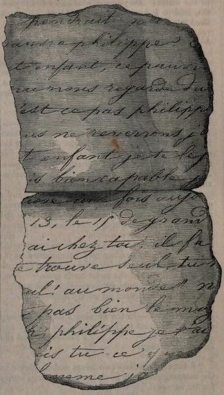 "With kindest regards,"Yours most truly,"D. HANDS."10. —Fragment of a Letter found in the Baron's room after the death of Madame R**.