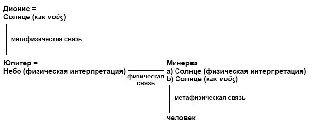 В том фрагменте, где Дионис-Солнце соотнесен с небесной сферой, Макробий метафизически истолковывает его как «умный» принцип этой сферы, а в отрывке, в котором Минерва-Солнце соотнесена с человеком[200], он метафизически понимает ее как источник ума (благоразумия) человека. Напротив, там, где Минерва-Солнце соотнесена с небесной сферой, Макробий истолковывает ее физически как эманацию сущности этой сферы.