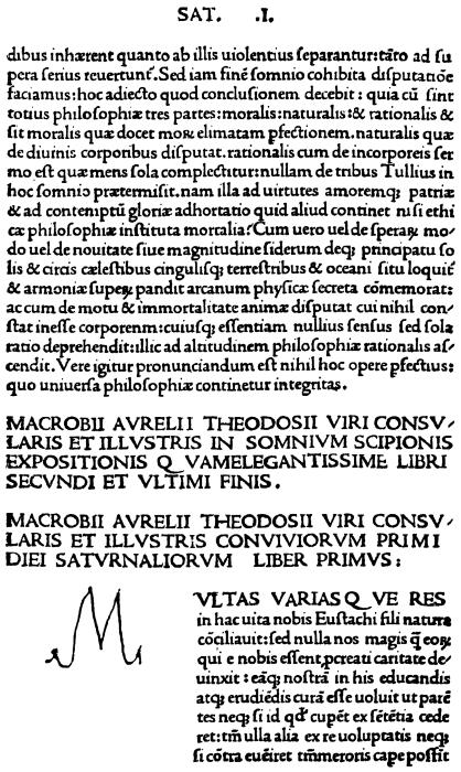 Страница из раннего издания сочинений Макробия(окончание Комментария на ‘Сон Сципиона’ и начало Сатурналий)