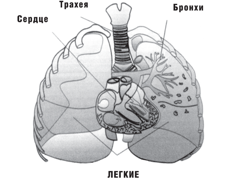 Рисунок 1. В грудной полости располагаются пять долей легких. Две левые доли заполняют левую сторону грудной полости. Три правые доли – верхняя, средняя и нижняя – заполняют правую часть грудной полости. Легкие отделяет от грудной стенки тонкая, шелковистая мембрана – плевра, – которая позволяет легким расширяться и сжиматься, не прилипая к грудной стенке. Сердце расположено между правым и левым легким, сместившись в левую сторону.