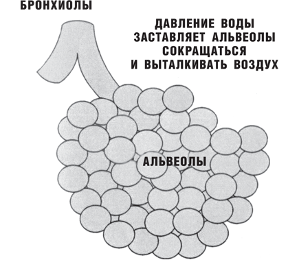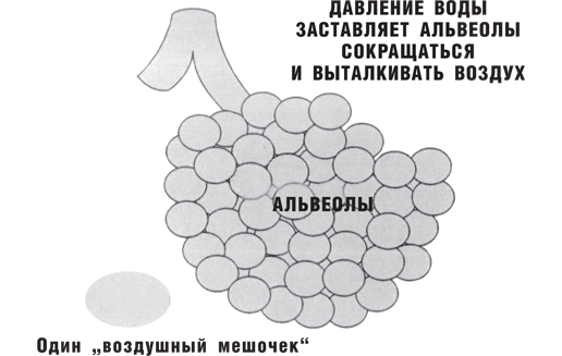 Рисунок 6. Движения грудной стенки и диафрагмы недостаточно для того, чтобы равномерно вытолкнуть воздух из «воздушных мешочков» (альвеол) на всем пространстве легких. Таких «воздушных мешочков» в легких сотни тысяч. И каждому из них нужно освободиться от воздуха, поступившего в процессе вдоха. Но тут есть один секрет. Когда мы делаем вдох, вместе с воздухом в альвеолы поступают крошечные молекулы воды. Обладая свойством притягиваться друг к другу, они соединяются и образуют водную оболочку, которая покрывает внутреннюю поверхность «воздушных мешочков».