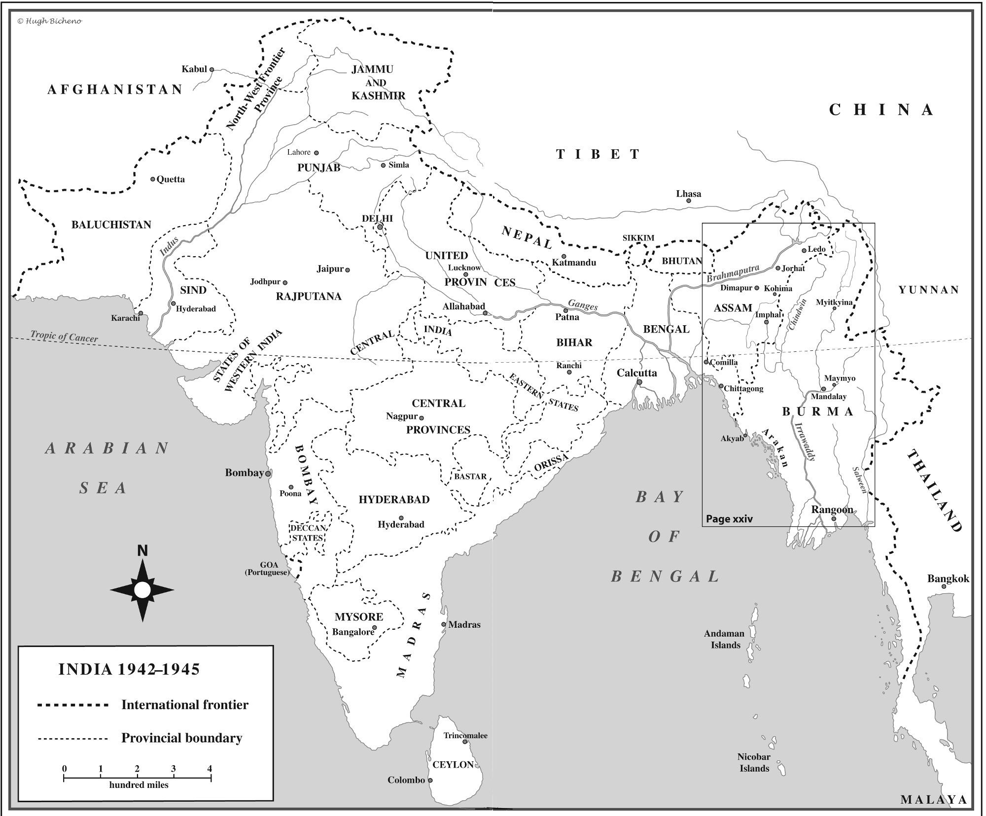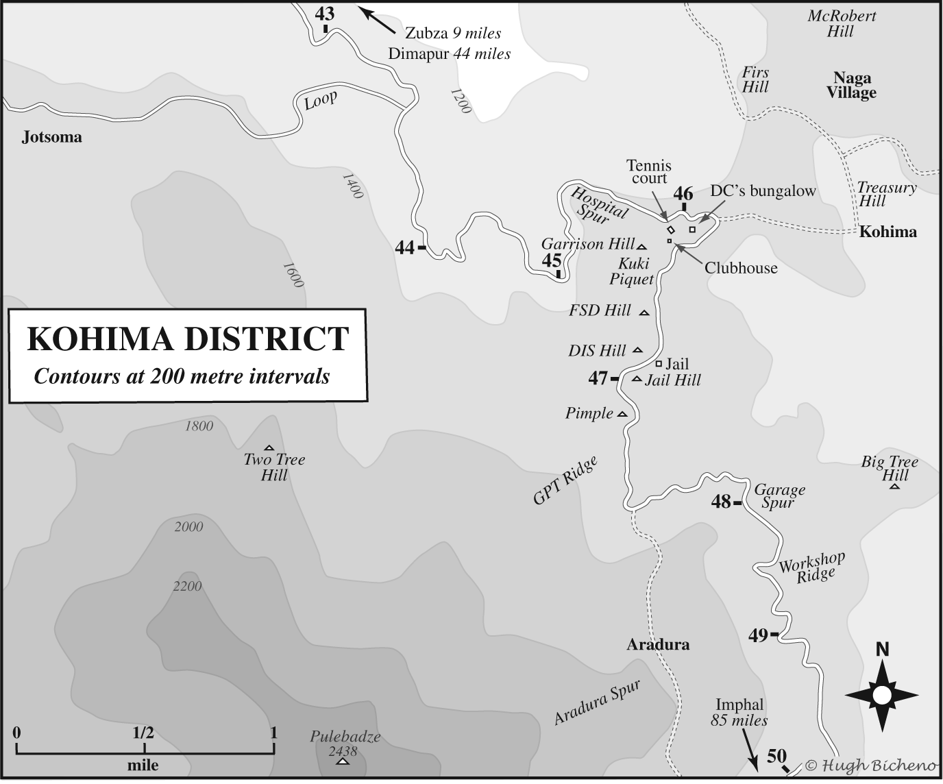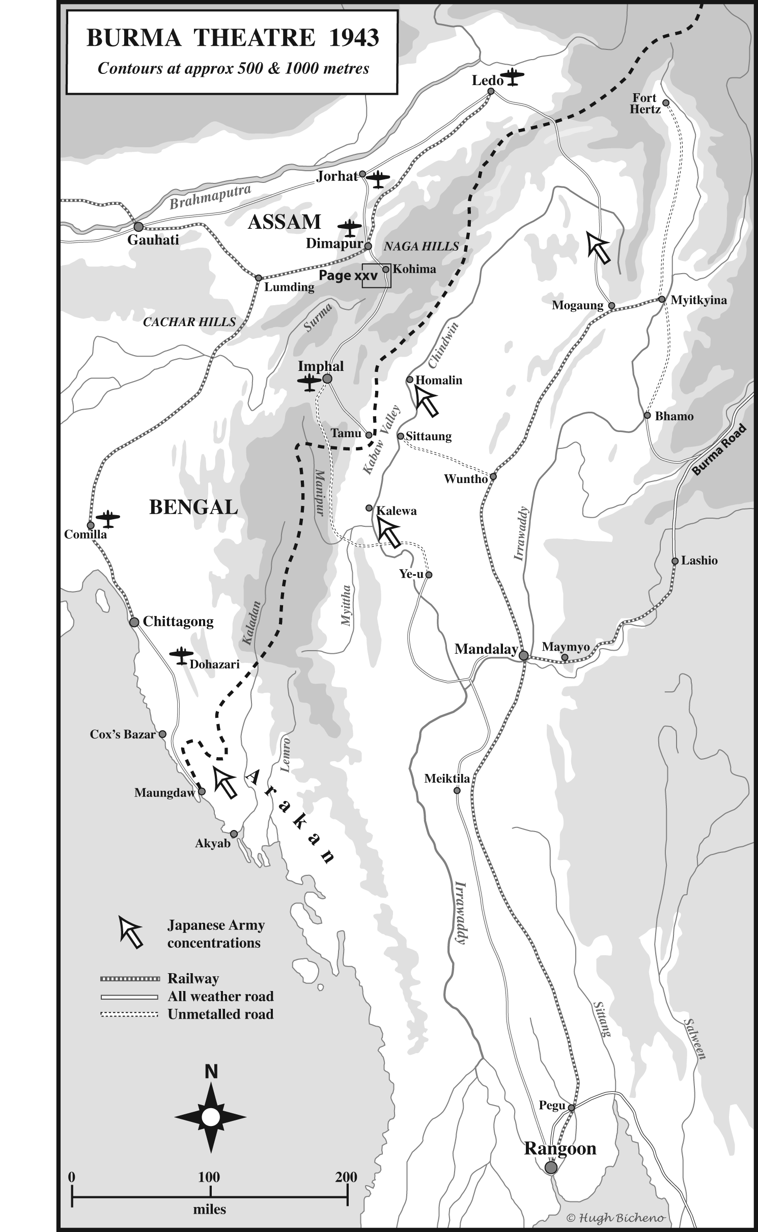 This book does not attempt to tell the story of every unit that fought at Kohima, nor does it describe in any detail the parallel battles fought ninety miles away at Imphal. The Imphal struggle, the adventures of Wingate’s Chindits and General ‘Vinegar Joe’ Stilwell’s Chinese divisions, and the interventions of Subhas Chandra Bose’s rebel Indian National Army are discussed only as they relate directly to events at Kohima. In telling the story of the British 2nd Division, which led the ousting of the Japanese from Kohima in the second phase of the battle, I have concentrated my particular attention on the remorseless politics of war. The division’s popular commander, Major General John Grover, was sacked from his job at the very moment of his triumph. A recommendation for a detailed account of the fighting exploits of the division is found at the end of chapter twenty-three.