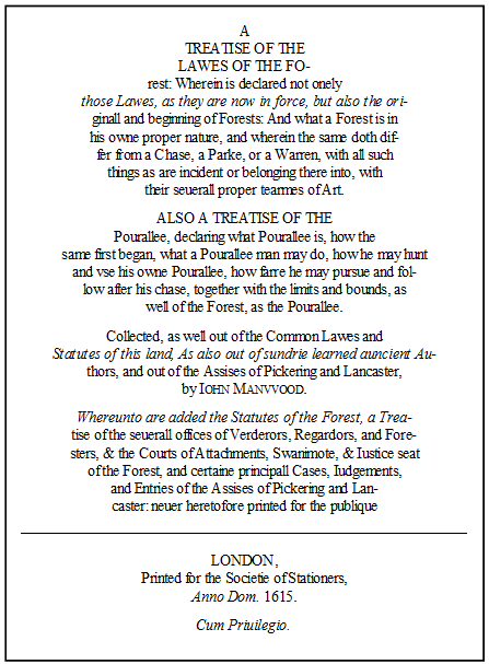 The forest laws are still on the statutes, but have fallen into desuetude; the last ‘forest court of justice seat’ was held under Charles I. The ‘forests’ themselves have also almost entirely vanished, some being abolished as late as Queen Victoria’s time, by act of parliament, but the last action under the ‘forest laws’ was had in 1862 when the Duke of Athole tried to establish his right as ‘forester’ for the crown. A full account of the forest laws is contained in Manwood’s volume, the title page of which is here reproduced.