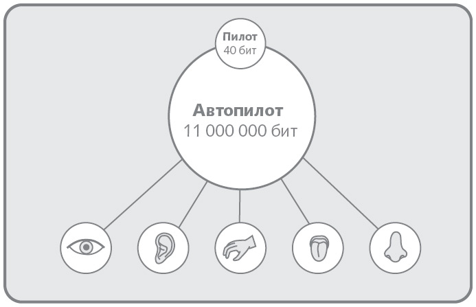 Если сравнить довольно ограниченную производительность пилота с огромным потенциалом автопилота, превосходство последнего становится очевидным. Классическая психология сообщает, что верхний предел оперативной памяти человека, на которой основана работа пилота, составляет 7 ± 2 элемента информации (чисел, букв, слов, лиц) одновременно, что соответствует примерно 40–50 битам, если речь идет о цифрах или буквах. Из-за ограниченной производительности пилота нам бывает трудно запомнить телефонные номера длиннее семи цифр. По той же причине нам трудно следить за презентацией, если рядом кто-то шепчется, звонит телефон или люди выходят из комнаты. Нас отвлекают, нам сложно уследить за речью, поэтому часть информации мы пропускаем. А если представить, сколько дел нужно переделать утром до ухода на работу, то станет ясно, что с пропускной способностью в 40 бит мы не добрались бы даже до двери! Если раздумывать в супермаркете над каждой покупкой, можно умереть от голода и жажды раньше, чем закончишь шопинг.