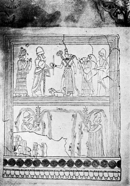 Царская инвеститура: царь Мари получает знаки власти от Иштар. Бородатая фигура царя, позади которого стоит богиня, левой рукой берет у Иштар жезл и кольцо, а правую воздевает в восхищении. На нем характерные для первой вавилонской династии тюрбан и одежда. Иштар предстает в своем военном аспекте, она вооружена, ее правая нога стоит на лежащем льве. Ей помогают бог и богиня, стоящие за ее спиной. Под ними две богини держат вазы, откуда изливается вода, в воде вверх-вниз плавают рыбы – тема плодородия. С правой стороны панели (на соседней странице) стилизованные деревья и животные и финиковая пальма