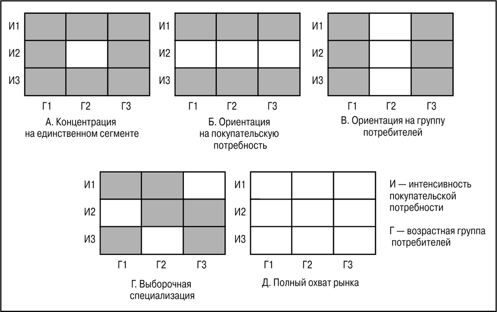 Фирма может решить выйти на один или несколько сегментов конкретного рынка. Предположим, что рынок болеутоляющего средства можно подразделить на три участка по интенсивности покупательской потребности (И1 – быстрое облегчение, И2 – долговременное облегчение, И3 – постепенное облегчение) и на три группы по признаку возраста потребителей (Г1 – молодежь, Г2 – люди среднего возраста, Г3 – пожилые люди). Сопоставляя интенсивность потребностей и возраст потребителей, можно выделить девять возможных сегментов рынка. У «Элен Кертис» есть один из пяти возможных путей выхода на этот рынок, представленных графически на рис. 2.4 и описанных ниже.