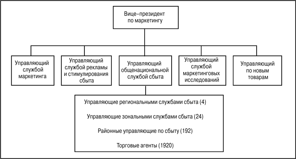 Фирма должна разработать такую структуру службы маркетинга, которая в состоянии взять на себя всю маркетинговую работу, включая планирование. Если фирма очень маленькая, все маркетинговые обязанности могут быть возложены на одного человека. Ему будет поручено заниматься и маркетинговыми исследованиями, и организацией сбыта, и рекламой, и службой сервиса для клиентов и т. д. Этого человека могут называть управляющим службой сбыта, управляющим по маркетингу или директором маркетинга. Если фирма большая, в ней обычно работают несколько специалистов в области маркетинга. Так, в штате компании «Элен Кертис» есть продавцы, управляющие службой сбыта, исследователи маркетинга, специалисты по рекламе, управляющие производствами простых и марочных товаров, управляющие по сегментам рынка и работники службы сервиса для клиентов. Осуществлением всех маркетинговых функций руководит отдел маркетинга.