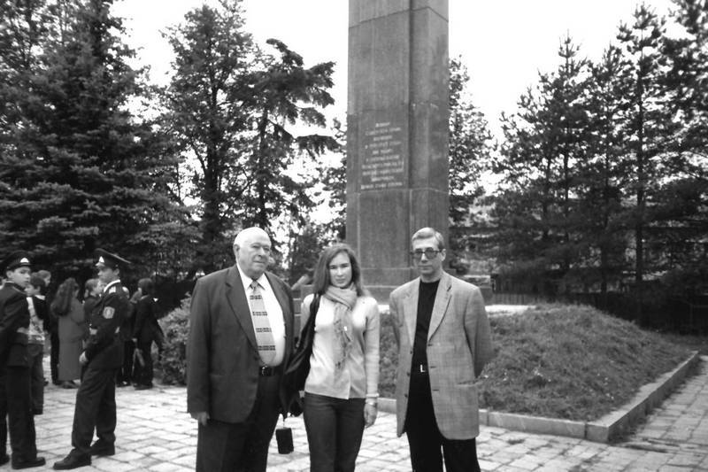Филипп Денисович Бобков, его внучка Дарья, помощник-референт В. С. Глаголев у памятника воинам, павшим в боях за Родину: город Белый Тверской области, который освобождали части 150-й стрелковой дивизии добровольцев-сибиряков, в составе которой воевал Ф. Д. Бобков