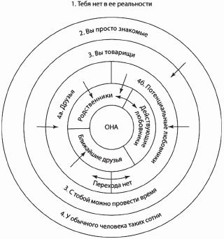 На этом мы, по большому счету, закончим со стратегиями и моделями, и дальше будем применять уже конкретные методики развития навыков, то есть перейдем от теории к практике. Что мы будем делать? Мы будем рассматривать женскую реальность и ее круги общения. Еще раз говорю – мы сейчас будем смотреть на женский мир с точки зрения женщины. Последовательно рассматривая все этапы ваших отношений, начиная с того, что вы даже не знаете о существования друг друга, заканчивая фазой действующих любовников. Это когда вы спите вместе, говоря простым языком. Я тут даже набросал рисунок (Рис. 5).