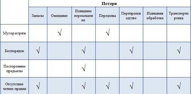 Кроме того, можно увидеть взаимосвязь нерациональной организации рабочих мест и потерь. Взгляните на табличку – сверху вы видите 7 видов потерь – излишние запасы, ожидания, перемещения, переделки, перепроизводство, излишнюю обработку и транспортировку. С левой стороны таблички – столбцы, в них вы можете видеть признаки нерациональной организации рабочих мест.
