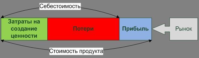 В lean нас интересует как раз себестоимость, то есть издержки, которые несёт организация при изготовлении определённого продукта или оказании услуги. Это те средства, которые необходимы для поддержания производства продукции и нормального существования организации. Необходимо покупать сырьё и материалы, организовывать и обслуживать весь процесс, чтобы он выдавал продукт, содержать основные средства и т.п. С точки зрения lean, себестоимость делится на издержки, необходимые для создания ценности для Заказчика (обязательные затраты или затраты, необходимые для создания ценности) и потери – бесполезных издержки (необязательные затраты). Называть их можно совершенно по-разному, главное понимать смысл.