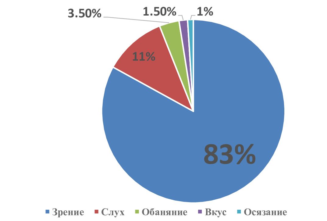 Фот ещё пара фактов. Человек воспринимает 83% информации, которую он видит и только 11% – которую слышит, 3,5% информации, которую он нюхает, 1,5% информации, которую он пробует на вкус и 1% информации, которую он ощущает.