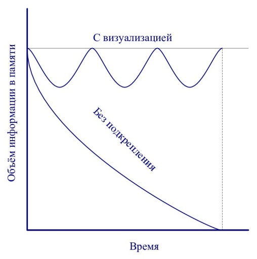 По графику (см. рисунок) можно сравнить, как уровень доведённой до работника информации меняется со временем. При простой беседе, инструктаже или собрании без использования визуализации, информация усваивается человеком, но с течением времени без присутствия какого-либо подкрепления (напоминания, использования, повторения), она забывается, что демонстрирует первая кривая. Вторая кривая графика показывает динамику уровня усвоенной работником информации при наличии визуального подкрепления, т.е. когда работник периодически возвращается к нужной информации, либо её основной части и вспоминает её. Вместо визуального подкрепления, таким же образом может срабатывать и постоянно востребованная в работе информация.