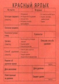 Все красные ярлыки объединяет несколько общих категорий данных. Это название предмета либо производственный номер предмета, категория предмета (все предметы можно разделить по категориям), количество предметов. Кроме этого, указываются причины, почему к предмету прикреплен красный ярлык. Например, он не используется для текущих операций, содержит дефект или излишнее количество дубликатов. Пишется подразделение, в чьем ведении находится данный предмет, иногда пишут стоимость предмета. Обычно всегда пишут дату, когда предмет помечен красным ярлыком. В некоторых местах отмечают способ удаления – утилизировать, передать на склад и т.д.