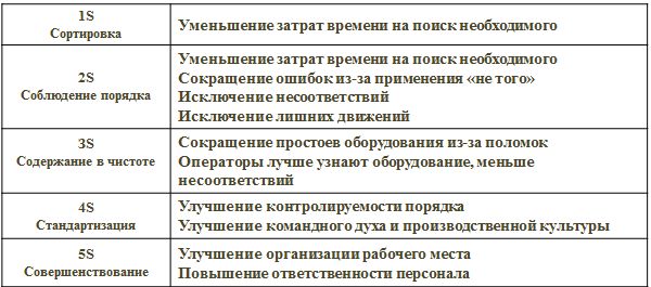 Основными критериями правильного применения 5S могут являться обеспечение безопасности труда, повышение производительности, улучшение качества продукции, уменьшение простоев оборудования, чистота, порядок на рабочем месте, отсутствие любых предметов, которые не относятся к текущей работе, когда визуально заметны любые отклонения в состоянии рабочего места. Еще один из критериев – это скорость нахождения необходимых предметов и эффективное использование в целом рабочего пространства.