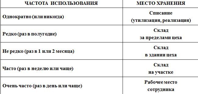 Если предмет используют редко (например, раз в полугодие), его можно хранить на складе, если мы говорим о цехе. Если об офисе – можно хранить в архиве либо в общем шкафу. Если предмет используют раз в неделю или чаще – возможно хранение на складе на участке, рядом с рабочим местом. Когда очень часто (раз в день или чаще), то место хранения – это рабочее место сотрудника, которое должно быть оборудовано так, чтобы можно было не тратить время на его поиск.
