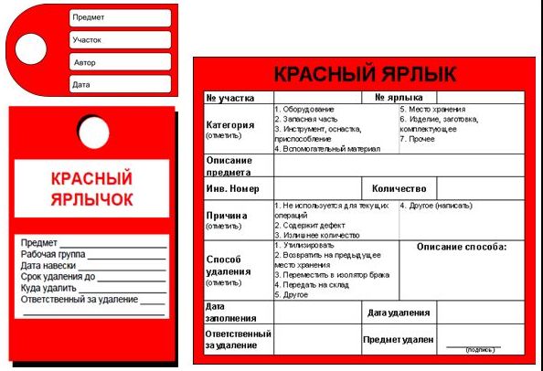 Наличие красного ярлыка неизбежно для сломанных, у которых истек срок годности, для требующих ремонта предметов, для деталей, оставшихся от производства продукции, а также для тары, личных вещей, мусора, избытка комплектующих, полуфабрикатов и готовой продукции, которая не сдана на склад, лишней мебели и т.д.